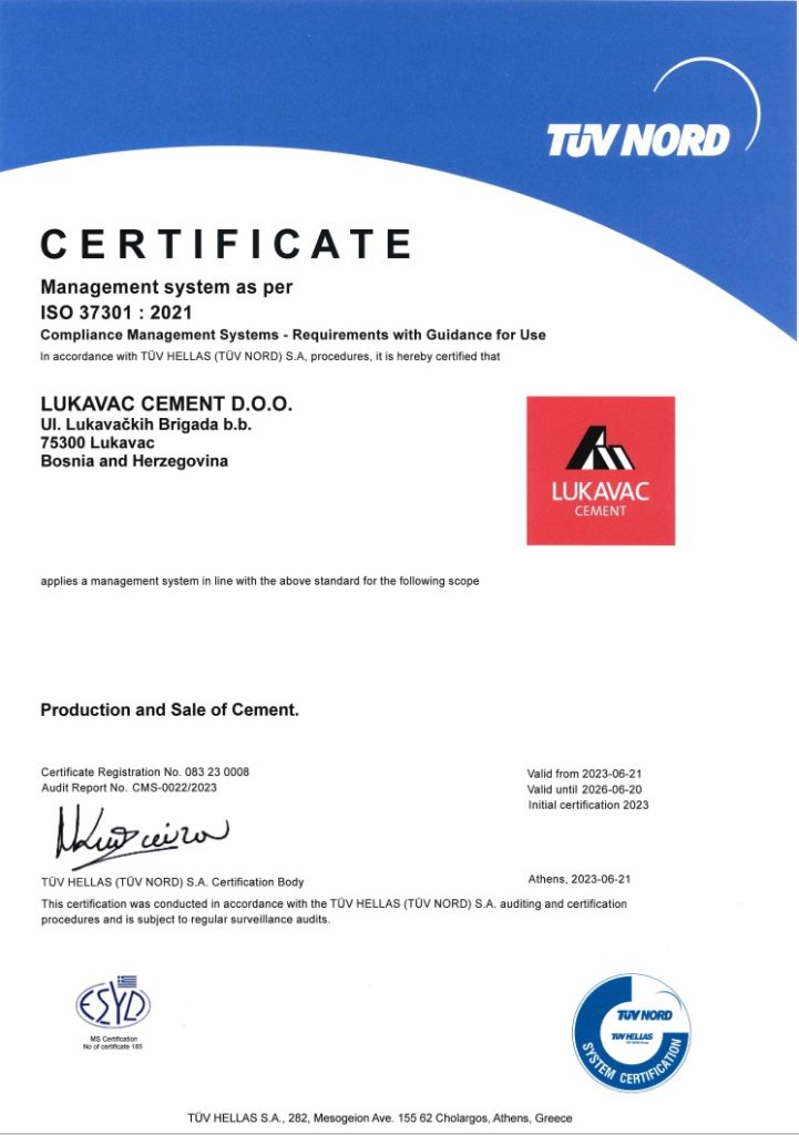 Lukavac Cement je od 2023. ponosni nosilac međunarodnog certifkata ISO 37301:2021(Sistem upravljanja usklađenošću), i to prvi na Zapadnom Balkanu. U današnjem poslovnom svijetu nije dovoljno samo biti uspješan. Neophodno je raditi ispravno, etično i u skladu sa svim zakonskim propisima.